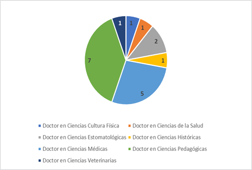 En otro orden de cosas, atemperado a este mismo pilar estratégico, la formación doctoral en la provincia se encuentra en ascenso con respecto a años precedentes, se cuenta con 18 doctores en ciencias distribuidos, como sigue el gráfico 2, según el área del conocimiento. La UCM en la actualidad consta de 15 doctorandos (ocho en Ciencias Pedagógicas (CP) y siete en Ciencias Médicas (CM)) y seis solicitantes (cinco en CM y uno en CE). Egresarán del diplomado predoctoral en el mes de septiembre del año en curso, como actividad de superación profesional, 43 profesionales. En un periodo corto de tiempo, con el perfeccionamiento en la redacción científica del tema de investigación y, el proyecto de investigación aprobado por las comisiones científicas establecidas; se enviarán al CITMA para la aprobación del tema doctoral.