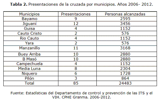 Estos datos permiten el acercamiento a la dimensión de la presentaciones en las que más de 20 000 personas en todos los municipios de la provincia (tabla 2).