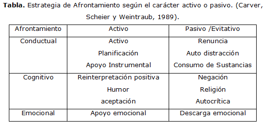 En el modelo de Carver y colaboradores 14 las modalidades de afrontamiento descriptas incluyen estrategias consideradas, indistintamente pasivas o activas según sean funcionales a la situación a afrontar. En la tabla se presenta una clasificación de las estrategias de afrontamiento.