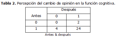En el estudio se presentan los siguientes resultados en la función cognitiva (tabla 2).