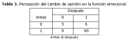 En la función emocional se obtuvieron 5 respuestas de pacientes de fallo antes de iniciar el tratamiento con la vacuna terapéutica y 5 respuestas de fallo al finalizar el tratamiento (tabla 3).