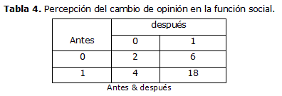 En cuanto al cambio de opinión en la función social resultó que 2 pacientes respondieron como fallo antes de iniciar el tratamiento con la vacuna y 2 pacientes dieron respuestas para fallo al terminar el tratamiento, por lo que no hubo cambio de opinión (tabla 4).