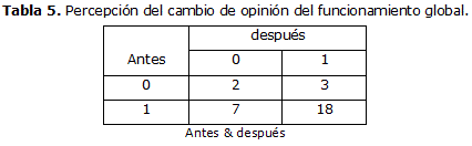 El cambio de opinión en la percepción global de cv es un aspecto importante por lo que expresa de manera integrada el paciente en una respuesta su criterio o evaluación sobre lo que ha percibido. De 30 respuestas de pacientes obtenidas del cuestionario la probabilidad de que el cambio no fuera significativo fue del 34%. Por tanto se acepta ho.