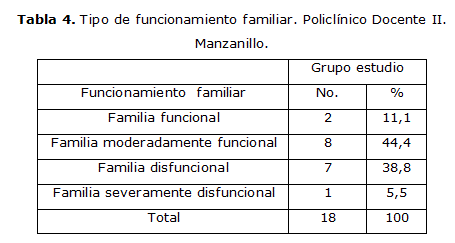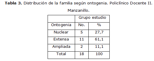 Predominan las familias extensas (61,1%) lo que implica que como característica general en nuestro país los hijos se casan y quedan viviendo con sus padres por carencia de espacios habitacionales para vivir como nueva familia constituida, dato que corresponde con la mayoría de los estudios cubanos (tabla 3).