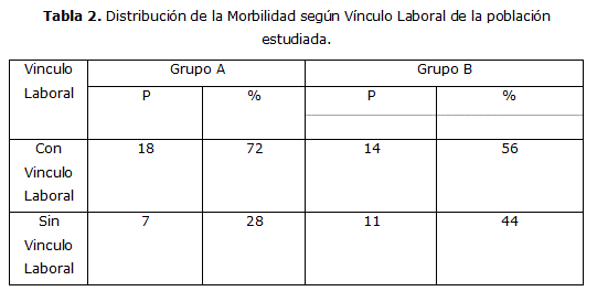 Diabetes Mellitus en la población estudiada para un total de 50 pacientes, existiendo predominio de los casos del sexo femenino, encontrándose la mayor cantidad de casos en el grupo etáreo de 31 a 40 años, con vínculo laboral (tabla 1 y tabla 2).