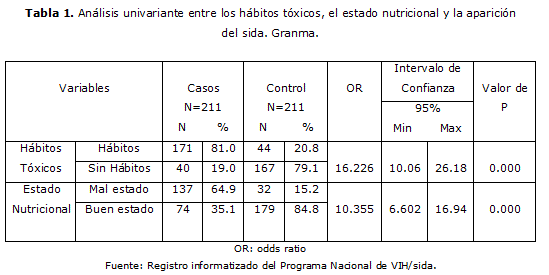 En el análisis univariante y multivariante de la variable hábitos tóxicos se demostró el gran peso que tiene en la aparición del sida en los individuos del estudio. El alcoholismo y tabaquismo producen efectos devastadores sobre la salud. Su repercusión negativa en los diferentes órganos y sistemas ocasionan enfermedades que muchas veces conducen irremediablemente a la muerte. Los resultados de un estudio revisado muestran que el 91,8 % de los individuos VIH positivos que evolucionaron al sida, fumaban una media de 24 cigarrillos al día por lo que se obtuvo una relación estadísticamente significativa.14