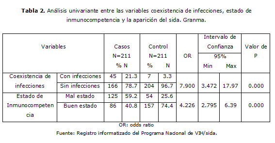 En la tabla 2, se muestra el análisis univariante entre las variables coexistencia de infecciones, estado de inmunocompetencia y la aparición del sida. Los seropositivos al VIH presentaron menos infecciones, sólo 3.3 %, y los enfermos de sida 21.3 %. La existencia de otras infecciones junto al VIH aumentó la posibilidad en 7.900 veces, p=0.000 de marcar sida.