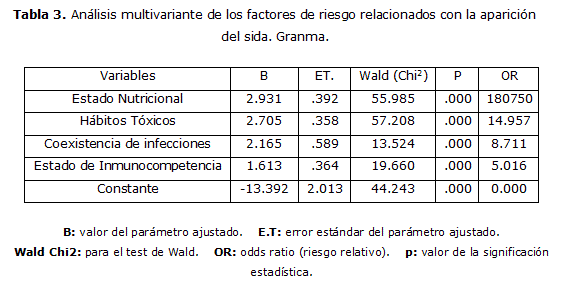 El análisis multivariante representado en la tabla 3, manifiesta la influencia absoluta y pura que en la enfermedad tienen las variables que se asociaron a la aparición del sida. Destacándose el gran valor del estado nutricional, OR=18.750 siendo en 18 veces la probabilidad de la aparición de sida en los mal nutridos que en los que no lo son, los hábitos tóxicos, OR=14.957 y la coexistencia de infecciones, OR= 8.711.