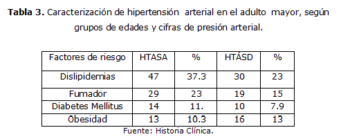 Las dislipemias (37%) ocuparon el primer lugar seguido del hábito de fumar con 23 % en los pacientes con HTASA, con respecto a los mismos factores de riesgos para los pacientes HTASD pero con un total de 30(23%) pacientes para la dislipemias y 15% para el hábito de fumar en los pacientes con HTASD (tabla 3).