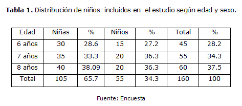 La tabla 1 muestra la distribución de los niños examinados, según edad y sexo, donde la mayor representación en cuanto a sexo de encontró en el femenino con 105 niñas de 160 examinados para un 65.7 %, siendo inferior el número de niños con 55 en total para un 34.3 %. En cuanto a la edad el grupo más representativo fue el de 8 años con 60 niños para un 37.5 %, siendo menor el de 6 años para un 28.2 %.