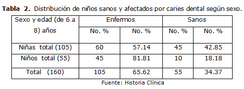 La tabla 2, muestra el comportamiento de la caries dental, en el grupo etáreo de niños estudiados, según el sexo, donde se pudo apreciar que en el caso de las niñas más del 50 porciento del total de hembras estuvo afectado por la enfermedad para un 57.14 %, y en el caso de los varones a pesar de ser menos en cantidad en comparación con el total de niñas, estuvieron afectados por la enfermedad en mayor porciento con 81.81 %. De manera general en el estudio predominaron los enfermos sobre los sanos con 105 de ambos sexos para un 65.62 %, con solo un 34.37 % de niños sanos de ambos sexos.
