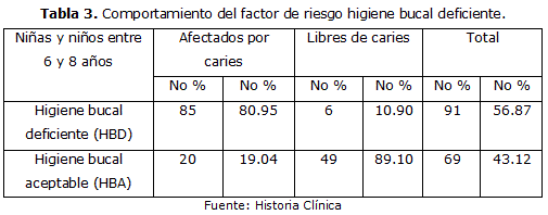 La higiene bucal deficiente fue otro factor que predominó en este estudio con un alto porcentaje; resultados similares obtuvo Duque de Estrada, 2 Luna,18 Cabrera,19 con resultados superiores al 75 % en nuestro país, la cual confirma que la mala higiene bucal es un riesgo significativo de caries dental relacionado con su prevalencia.
