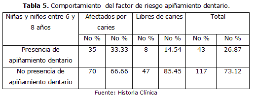 La tabla 5 muestra, como se comporta el apiñamiento dentario en los niños estudiados de ambos sexos. Donde se observó que a pesar de que este factor de riesgo no fue predominante, en el caso de los niños enfermos estuvo presente en 35 niños para un 33.33 %, lo que indicó que también tiene cierta influencia como factor predisponerte de la caries dental. En los niños sanos o libres de caries, apareció el factor de riesgo en 8 de ellos, lo que representa un 14.54 %, los mismos estaban libres de caries, pero presentaron maloclusión por apiñamiento ligero e inflamación gingival, que aunque no fue el objetivo de nuestro trabajo, quedó demostrado que este factor no solo es predisponente para las caries, sino que además es un factor importante a considerar en enfermedades como la gingivitis y la maloclusión.