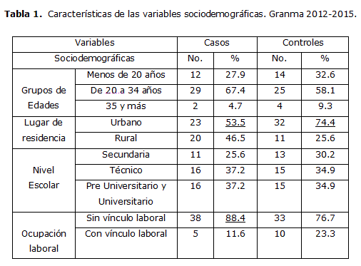 El grupo de controles con 43 embarazadas serologías reactivas al VDRL, pero sin diagnóstico confirmatorio por TPHA, se seleccionaron a través de un muestreo aleatorio simple a razón de 1:1. Se excluyeron las embarazadas que se les interrumpió el embarazo durante el estudio y por dirección no eran de la provincia Granma. Como factores de riesgo se consideraron, edad, nivel escolaridad, nivel ocupacional, lugar de residencia y las variables de comportamiento sexual como: protección durante las relaciones sexuales, antecedentes de otras ITS antes del embarazo, estabilidad de la pareja sexual.