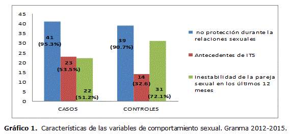 El gráfico 1 demuestra las variables relacionadas con el comportamiento sexual de las embarazadas, se resaltan con mayor incidencia en el grupo de casos, la no protección durante las relaciones sexuales con 41 casos para un 95,3 %, los antecedentes de infecciones de transmisión sexual con 53.5 %, con respecto a los controles la inestabilidad de la pareja en los últimos 12 meses superaron el grupo de casos con un 72.1 %.