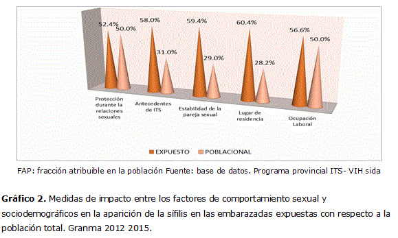 En el gráfico 2 se evaluaron las medidas de impactos (FAP) para los factores de riesgo sociodemográficas y de comportamiento sexual estadísticamente significativo, teniendo mayor impacto en los expuestos, el lugar de residencia en un 60.4 %, estabilidad de la pareja sexual en un 59.4 % y los antecedentes de ITS ante del embarazo con un 58.0 %, atribuible a la exposición de cada factor, lo que demuestra que el daño podría ser reducido si los factores de riesgo causales desaparecieran de la población total.