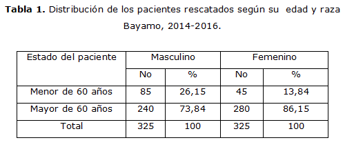 La muestra estuvo integrada por 325 pacientes trasladados por el sistema integrado de urgencias médicas. Se realizó la caracterización de la muestra un total 280 (86,15 %) eran mayores de 60 años de sexo femenino, 240 (73,84 %) mayores de 60 años todos masculino. (tabla 1)