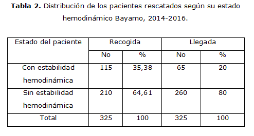 En la tabla 2 se muestra que un total de 115 (35,38 %) tuvieron estabilidad hemodinámica en la recogida en el centro asistencial que remite, 210 (64,61 %) no presentaron estabilidad hemodinámica, solo 65 (20 %) pacientes presentaron estabilidad hemodinámica a la llegada al centro hospitalario, 260 (80 %) no tuvieron estabilidad hemodinámica a la llegada al centro hospitalario.