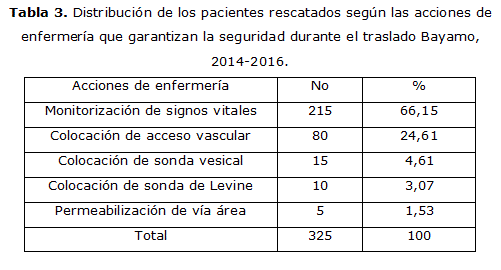 La tabla 3 muestra las acciones de enfermería realizadas que garantizan la seguridad del paciente durante el traslado lo más significativo es que en 215 (66,15 %) fueron monitorizados con la acción de medición de signos vitales, seguido de 80 (24,61 %) de los casos a quienes se les realizó la técnica de acceso vascular.
