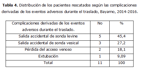 La tabla 4 refleja las complicaciones derivadas de los eventos adversos durante el traslado en un total de 5 (45,4 %) pacientes se produjo salida accidental de la sonda de Levine, menos incidencia de salida accidental de sonda vesical solo en 3 (27,2 %) de los casos.