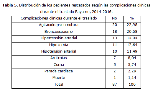 En relación con las complicaciones clínicas durante el traslado 20 (22,98 %) pacientes presentaron la agitación psicomotora, 18 (20,68 %) el broncoespasmo, apareció en 13 (14,94 %) pacientes la hipertensión arterial y en 10 (11,49 %) pacientes la hipotensión arterial solo en 11 (12,64 %) pacientes presentaron hipoxemia (tabla 5).