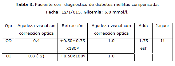 Por las alteraciones que ocasiona la diabetes mellitus en la salud del individuo, sobre todo a nivel oftalmológico y el impacto que produce en estos pacientes, se decide realizar la presentación de este caso. El diagnóstico precoz de esta enfermedad es importante ya que nos permite realizar un adecuado control y tratamiento para evitar complicaciones viscerales graves. (tabla 1, tabla 2 y tabla 3)