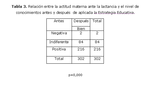 Antes de la intervención, el 33,1% de las gestantes tenían poca motivación para amamantar y el 28.5% mantenían una actitud indiferente hacia la lactancia. Luego de aplicada la estrategia educativa, todas las gestantes tenían una adecuada actitud y gran motivación acerca de la lactancia materna. (tabla 2 y tabla 3)