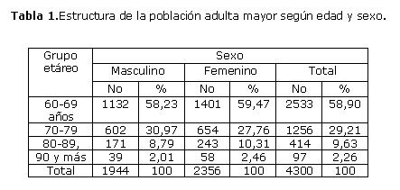 Al referirse a la estructura de la población adulta mayor según edad y sexo podemos decir que predominó el grupo etáreo de 60 a 69 años para 58.9 %, seguido del grupo de 70 a 79 años con 29.21%, el sexo femenino fue el que mayor número de pacientes presentó con 1401 para el 59.47% y 654 para el 27.76% respectivamente. (tabla 1)
