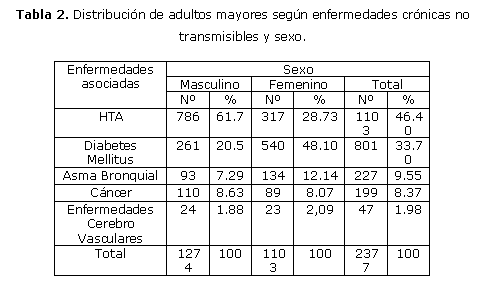 Se encontró una alta prevalencia de enfermedades crónicas no trasmisibles; 46.40 % de los gerontes presentaron hipertensión arterial, seguido de la diabetes mellitus en 33.70 %. Le siguieron en orden decreciente por debajo del 10 % el asma bronquial, el cáncer y la enfermedad cerebrovascular. El análisis diferencial por sexo muestra tasas superiores en el sexo masculino para las causas seleccionadas, excepto en la diabetes mellitus y el asma bronquial con una prevalencia mayor en las mujeres. (tabla 2)