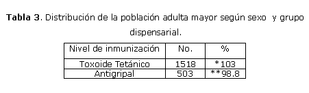 - Predominó la población de adulta mayor del sexo femenino entre 60 a 69 años con hipertensión arterial y diabetes mellitus, clasificadas en el grupo dispensarial III y adecuado nivel de inmunitario.