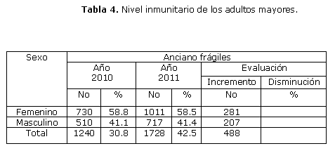 Se clasificaron como ancianos frágiles en el año 2010 el 30,8 %, aumentando el mismo al 42.5 % en el año 2011. Comparando los resultados por sexo no se muestran diferencias concluyentes. Se mostró un incrementó en ancianos frágiles en 488 pacientes en el año 2011. Se muestra una diferencia de proporciones de p<0.5 por lo tanto los resultados fueron estadísticamente significativos. (tabla 5)