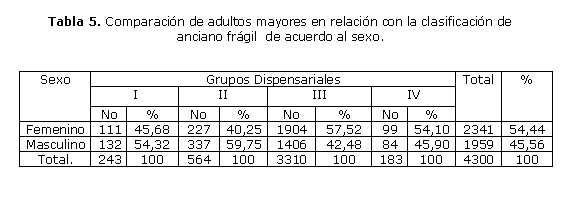 Se describe la dispensarización de los adultos mayores del área de salud estudiada, observándose que 3310 adultos mayores se encuentran dispensarizados en el grupo III, es decir enfermos con padecimientos crónicos, de ellos 1904 pertenecieron al sexo femenino para 57.52% y 1406 al masculino para 42.42%. (tabla 3)