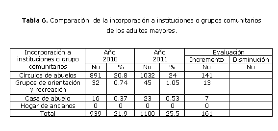 La incorporación a instituciones o grupos comunitarios se mostró fundamentalmente a través de la afiliación a círculos de abuelos, se logró en 20.8 % en el año 2010 aumentando a 24 % en el año 2011, con un incremento de 141 ancianos. A pesar que se observa movimiento de un año a otro, no se cumple con el indicador de incorporación al mismo, que se debe corresponde con el 47 % de la población adulta mayor. Varió de 0.74 al 1.05 % la inclusión de los ancianos a grupos de orientación y recreación con un incrementos solo de 13 gerontes. Solo 7 pacientes fue el incremento en incorporación a casa de abuelos, los porcientos no muestra resultados significativos para esta indicador. (tabla 6)