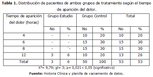 La distribución de pacientes por grupos de tratamiento según el tiempo de aparición del dolor se muestra en la tabla 1. Siendo notorio destacar que en el grupo estudio la aparición del dolor aconteció 12h después del procedimiento quirúrgico y sólo en tres pacientes, no así en el grupo control que desde las cuatro horas se reportaban 10 pacientes con dolor. Además la prueba Chi cuadrado (X2) de independencia arrojó diferencias significativas, por lo que concluye que las variables están relacionadas.