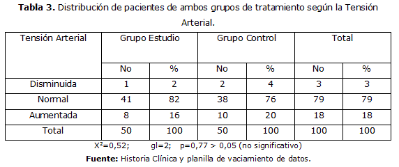 Resultados significativos desde el punto de vista estadístico arrojó la aplicación de la prueba Chi cuadrado (X2) de independencia, en relación al aumento ligero de la tensión arterial en los grupos de tratamientos a las 4h del posoperatorio (tabla 3). Prevaleciendo los pacientes con TA normal: 47 pacientes (94%) en el grupo estudio y 38 pacientes (76%) en el grupo control.