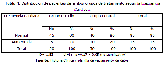 La tabla 4 muestra que los pacientes distribuidos por grupos presentaban una frecuencia cardiaca normal: 49 pacientes (98%) en el grupo estudio y 42 pacientes (84%) en el grupo control. Sin embargo la prueba Chi cuadrado (X2) de independencia arrojó diferencias significativas, por lo que concluye que en el grupo control la presencia de dolor puede ser causa del aumento discreto de la frecuencia cardiaca.
