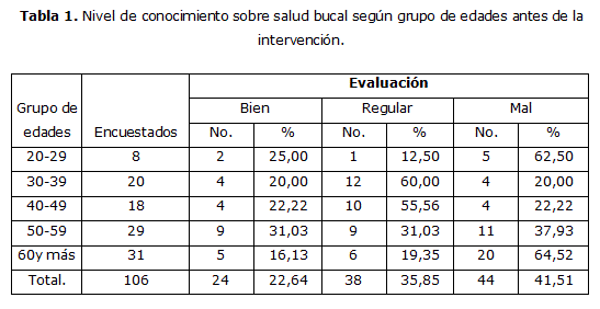En la tabla 1 se observa el nivel de conocimiento sobre salud bucal según grupo de edades antes de la intervención, donde se aprecia que el grupo más afectado fue el de 60 y más con el 64.52 % de respuestas contestadas incorrectamente.