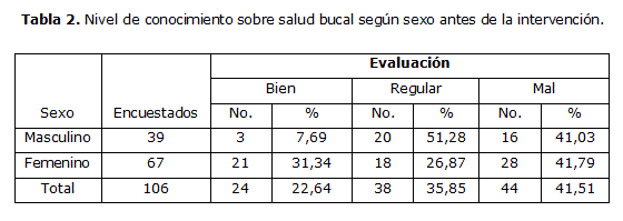 El nivel de conocimiento, antes de emplear la intervención fue evaluado de mal, el grupo de edad más afectado fue el de 60 años, en cuanto al sexo no se encontraron diferencias. Las necesidades de aprendizaje se identificaron mediante las respuestas incorrectas de la encuesta de conocimientos. La aplicación de la intervención educativa demostró ser un instrumento práctico para modificar el nivel de conocimiento y la intervención educativa elevó el nivel de conocimiento de los trabajadores sobre salud bucal.
