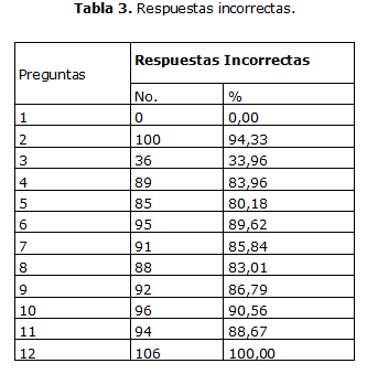 En la tabla 3 se muestran las respuestas incorrectas, antes de la intervención, las preguntas con mayores problemas fueron la 12, 10,6, y la 2. Se determinaron estas preguntas, pues los trabajadores expusieron que el tiempo, las labores en la escuela y en el hogar, el horario docente, las condiciones de vida, actitudes, factores de riesgos, no daban paso para asistir al servicio de Estomatología. Sin embargo después que se realizó el estudio quedaron motivados en asistir a la consulta.