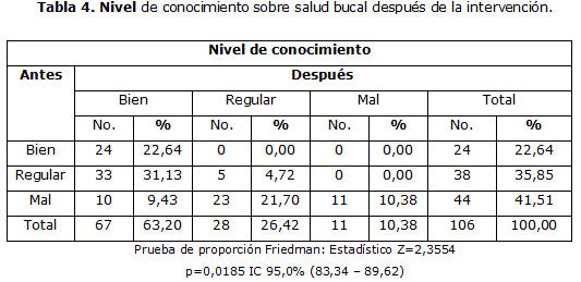 En la tabla 4 se observa, el impacto en el nivel de conocimientos sobre salud bucal, después de aplicada la intervención. Como vemos antes de la intervención según grupo de edades, tenemos que la calificación de mal representó 41.50 %, después de la intervención este resultado demostró que esta evaluación disminuyó a 10.37 %, la calificación de regular antes de la intervención era de 35.84 %, luego fue de 26.41% y por último la calificación de bien antes de la intervención representó el 22.64 % y después aumentó significativamente a un 63.20%, todo esto evidencia la efectividad del método en la intervención empleada.