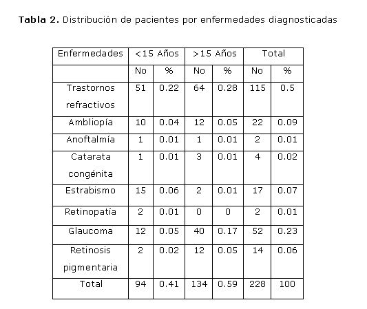 En la distribución de pacientes según enfermedades diagnosticadas y edad (tabla 2). Los trastornos de la refracción fue la enfermedad que mayor porcentaje alcanzó con 115 pacientes para 0,50%.