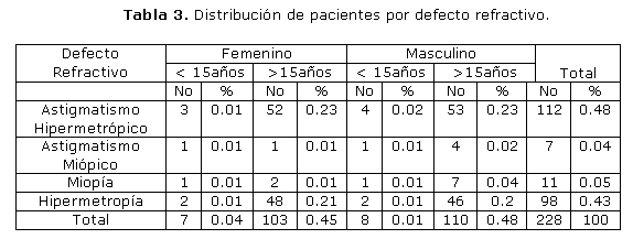 En la distribución de pacientes según defectos refractivos el más frecuente fue el astigmatismo hipermetrópico con 122 pacientes para un 0,48 % y la hipermetropía con 98 pacientes para un 0,43 %.(tabla 3)