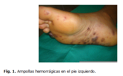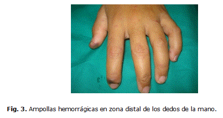 A los 9 días se detectaron lesiones cutáneas localizadas en los pies (Fig. 1 y Fig. 2), y manos (Fig. 3) bilaterales y simétricas; eritematovesicoampollares, con ampollas y vesículas densas de contenido hemorrágico rodeadas de halo eritematoso.