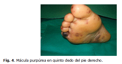 En el examen físico también se observó en el quinto dedo del pie derecho mácula purpúrea, redondeada, de aproximadamente 1 cm de diámetro, de bordes bien delimitados (Fig. 4).