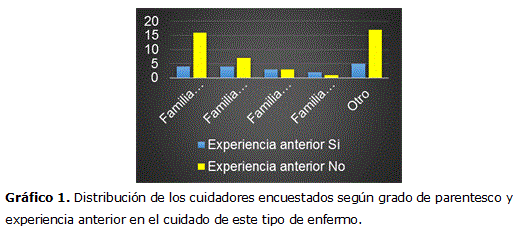 De un universo de 64 cuidadores encuestados predominó el sexo femenino (79,69%), la 6ta década de la vida (media de edad de 50,76 años), el preuniversitario terminado (43,75%). En el gráfico 1 se observa el predominio de los cuidadores en la categoría de otro (34,38%) y la no experiencia anterior en el cuidado de este tipo de enfermo (71,88%).
