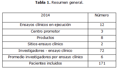 En el periodo de análisis se ejecutan 12 ensayos clínicos, con un total de 8 productos evaluados correspondientes a 3 centros promotores. El número total de sitios clínicos - ensayos clínicos fue de 2 y participaron un total de 72 investigadores. Se incluyeron 171 pacientes en todo el período.