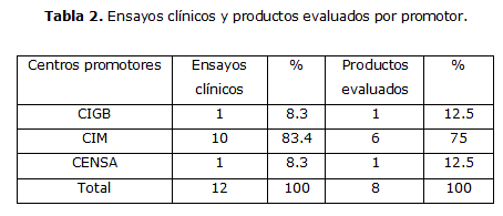 Si se analizan según el centro promotor (tabla 2), el Centro de Inmunología Molecular (CIM) constituyen el 83.4 % del total de ensayos ejecutados, mientras el Centro de Ingeniería Genética y Biotecnología (CIGB y el Centro Nacional de Sanidad Agropecuaria (CENSA). representan el 16% restante.