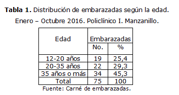 Al distribuir las embarazadas según la edad (tabla 1), llama la atención el predominio de aquellas con edades elevadas para la gestación (35 años y más) representando estas casi la mitad de las estudiadas seguidas por un amplio margen por las de 20 a 35 años.
