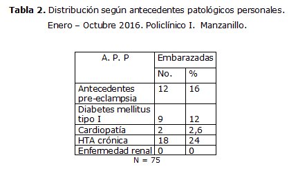 La tabla 2, muestra la distribución de las gestantes según los antecedentes patológicos personales. La hipertensión arterial crónica emerge con la mayor prevalencia con 24 % del total.