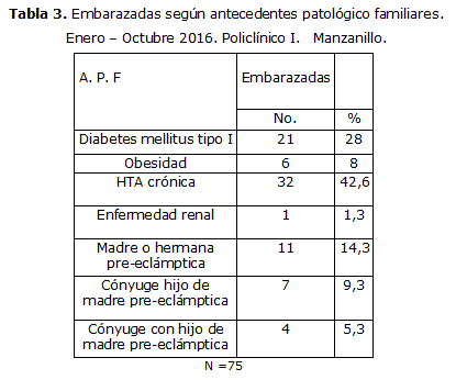 La pesquisa de antecedentes familiares, representados en la tabla 3, coloca en lugar cimero la hipertensión arterial (32 casos para 42,6 %).